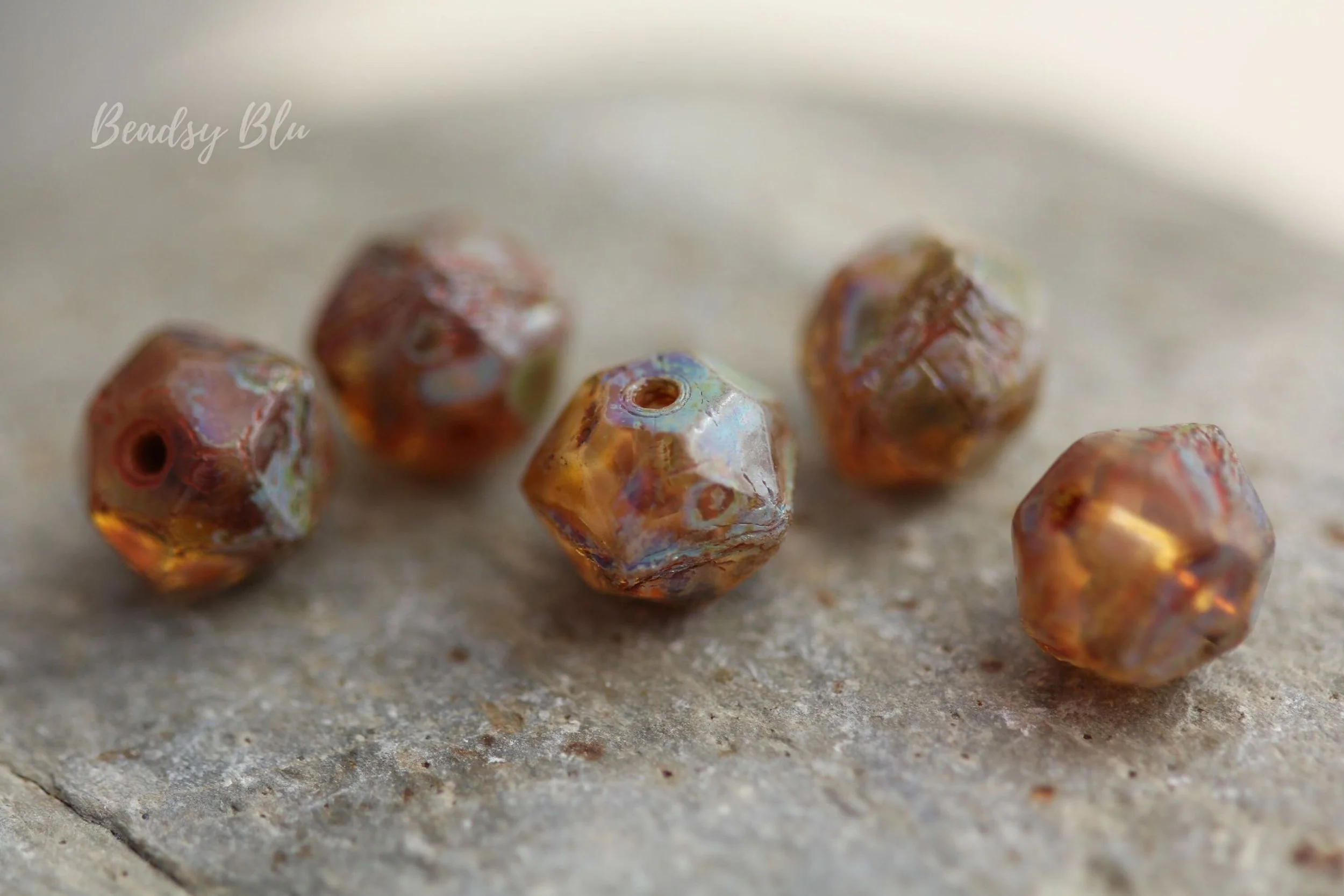 Premium Czech glass English cut beads in transparent brown with coral wash and blue/grey, moss green picasso finish.