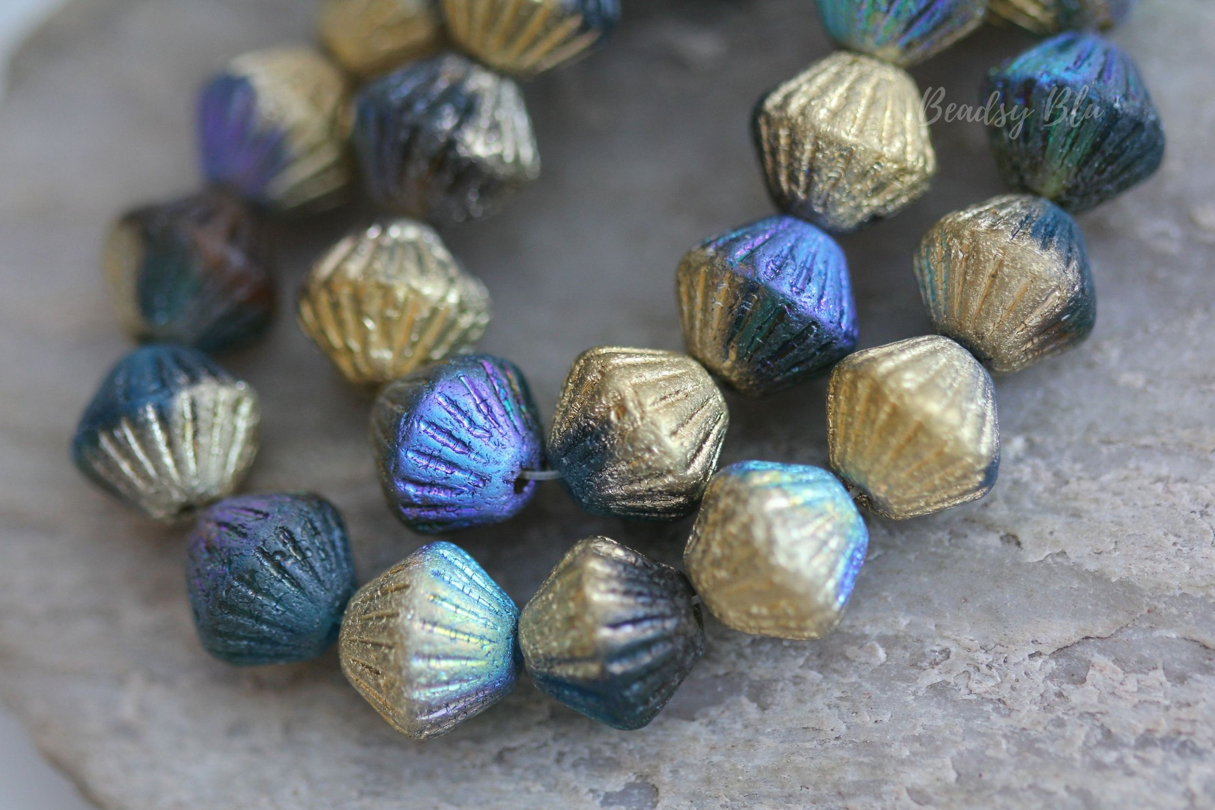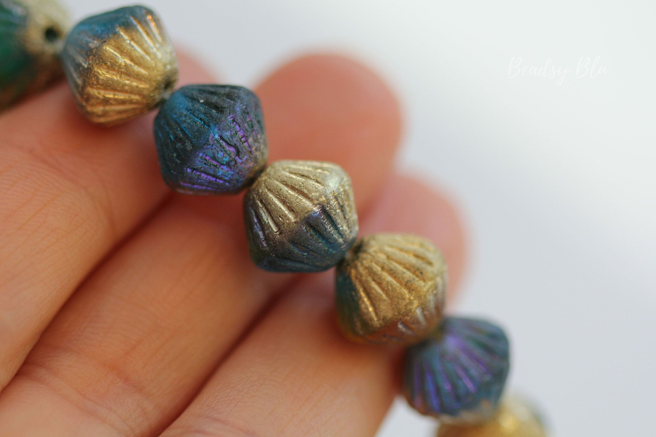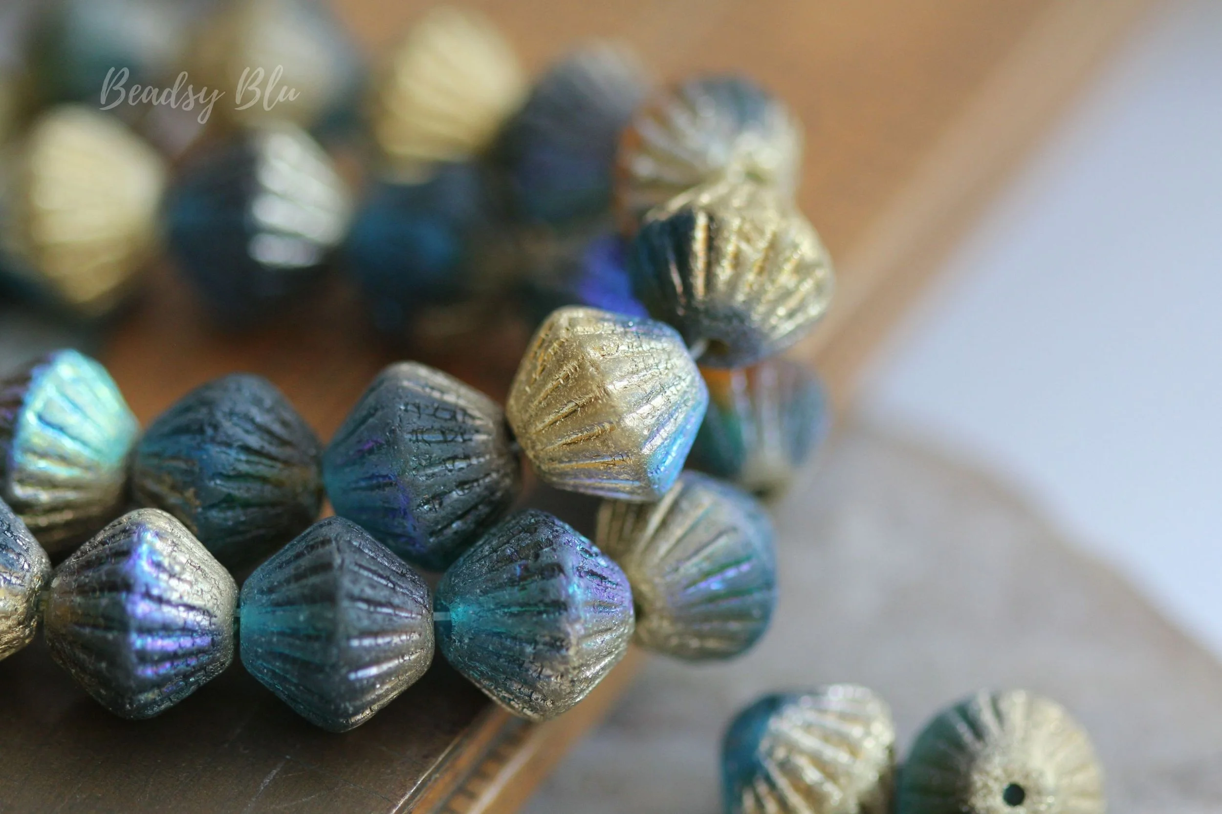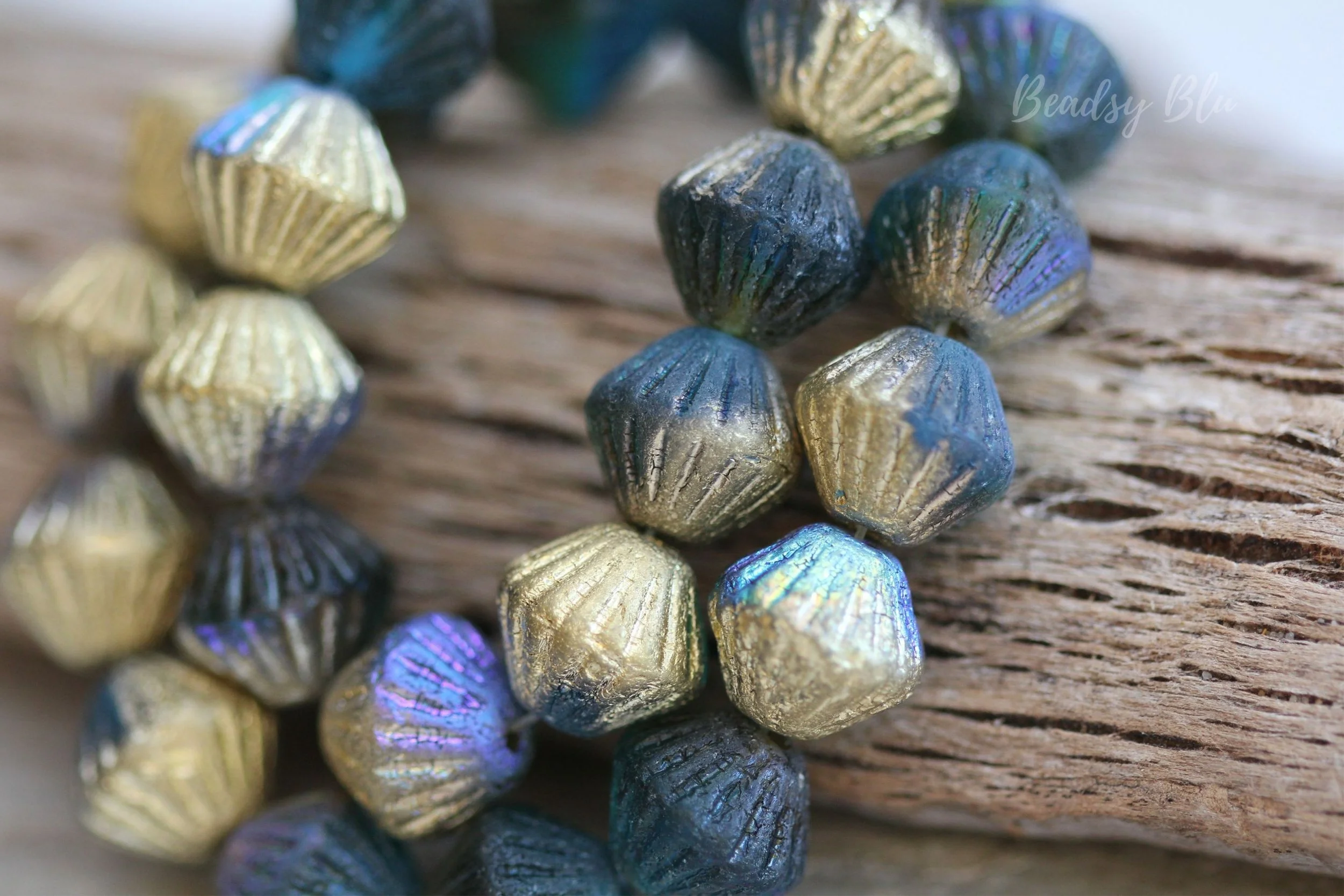 Premium Czech glass puffy African bicone beads in blend of translucent blue, emerald and yellow with rustic etched finish and partial gold and aurora borealis finish. Rustic etched finish gives these beads a natural and aged look.