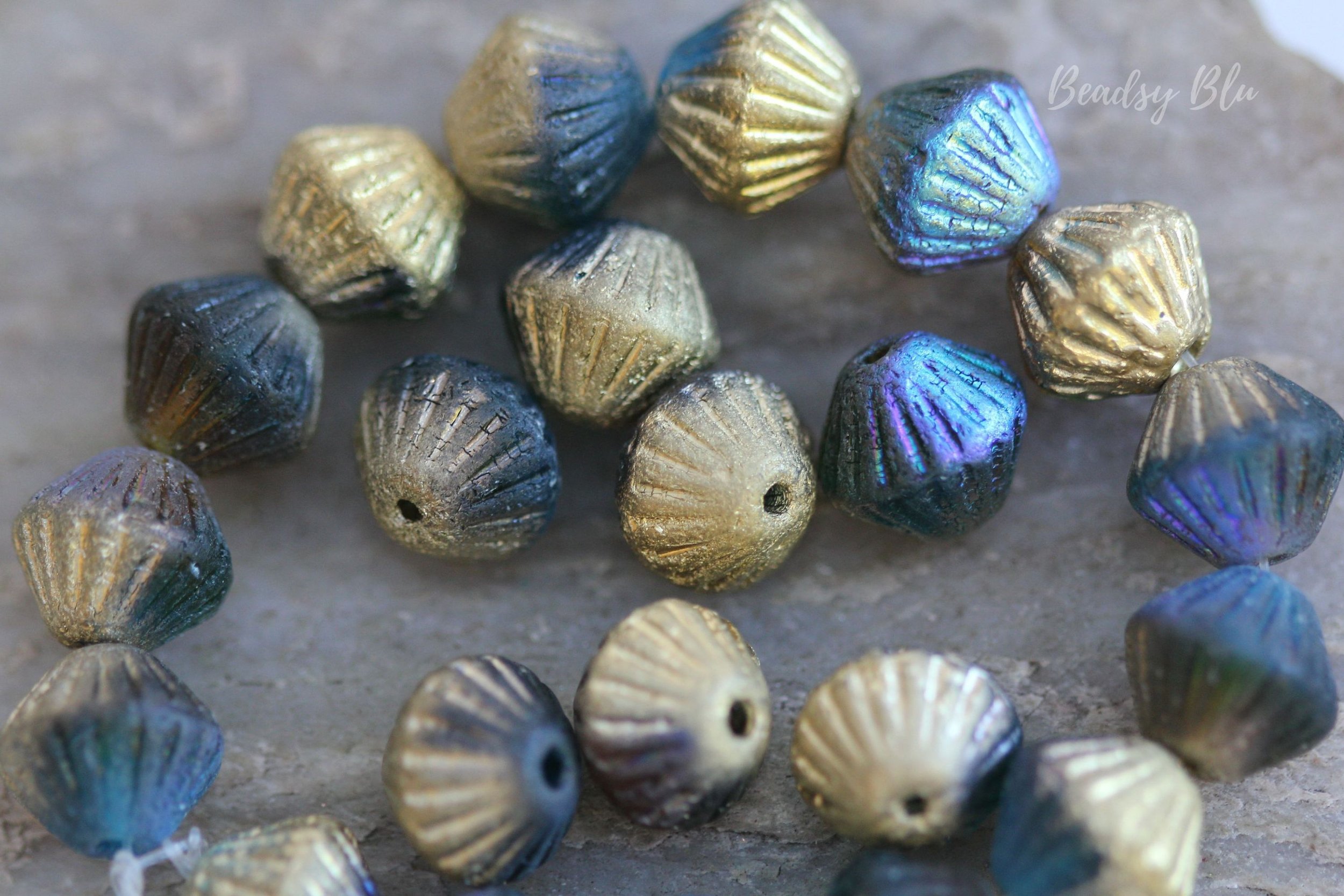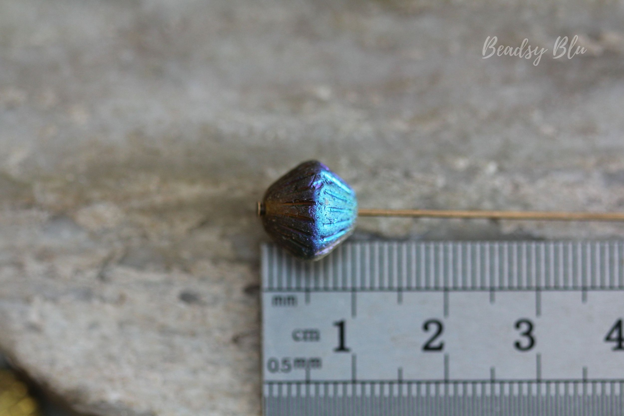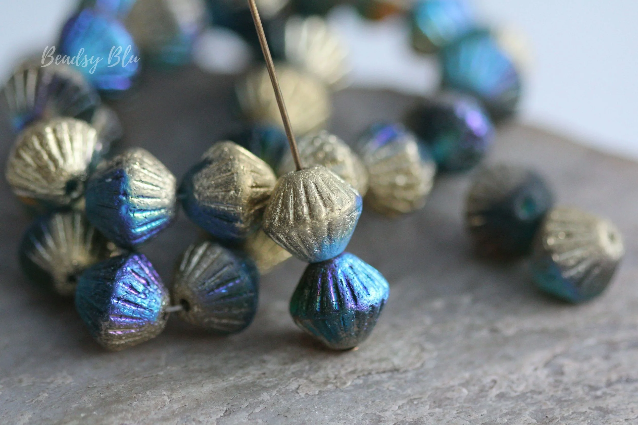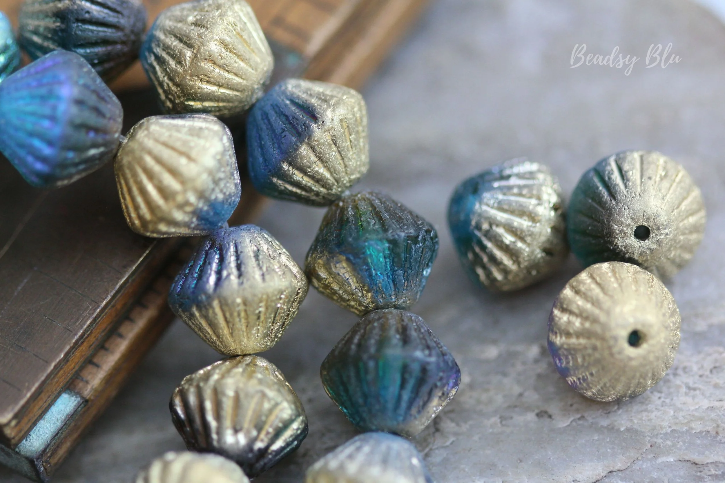 Premium Czech glass puffy African bicone beads in blend of translucent blue, emerald and yellow with rustic etched finish and partial gold and aurora borealis finish. Rustic etched finish gives these beads a natural and aged look.