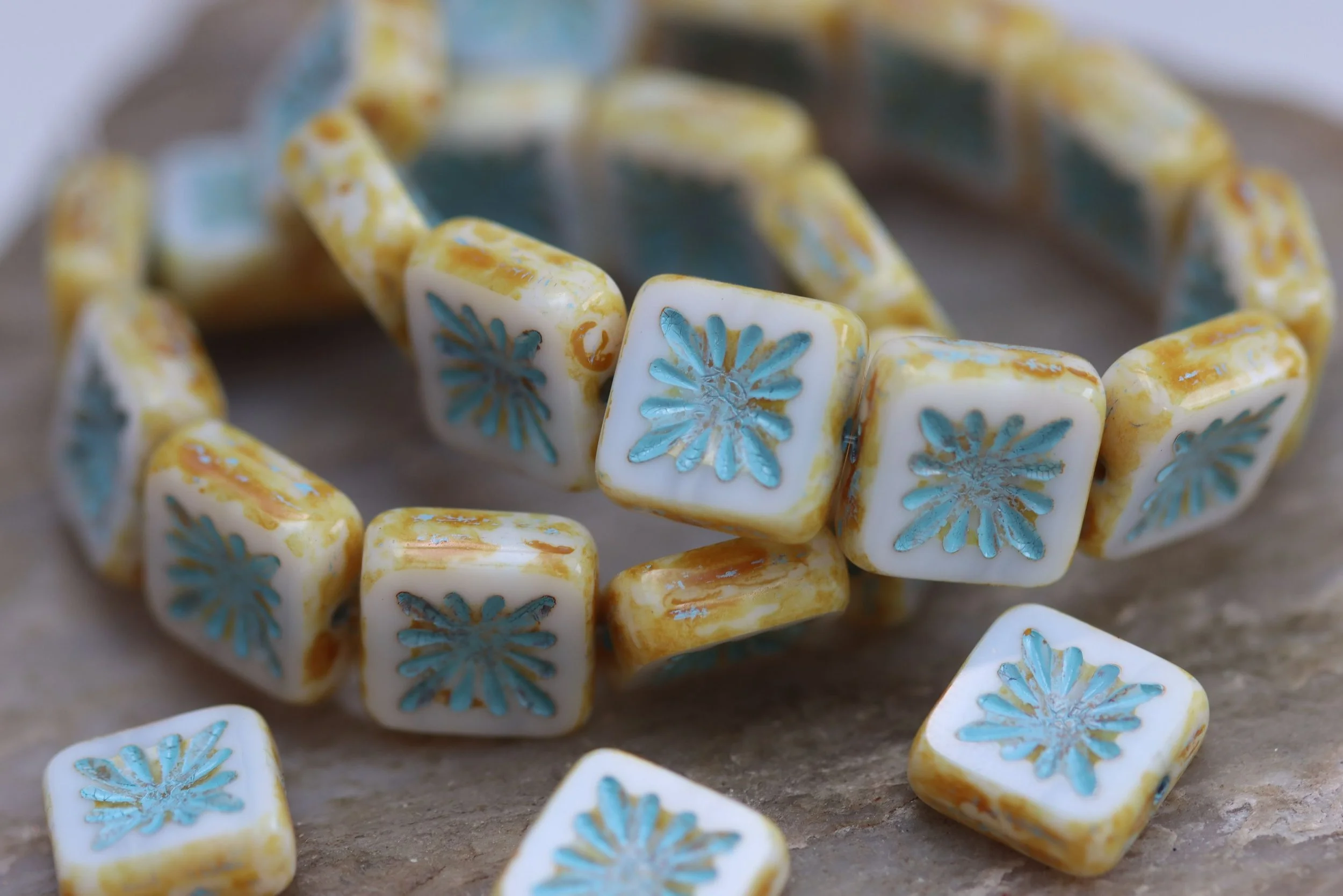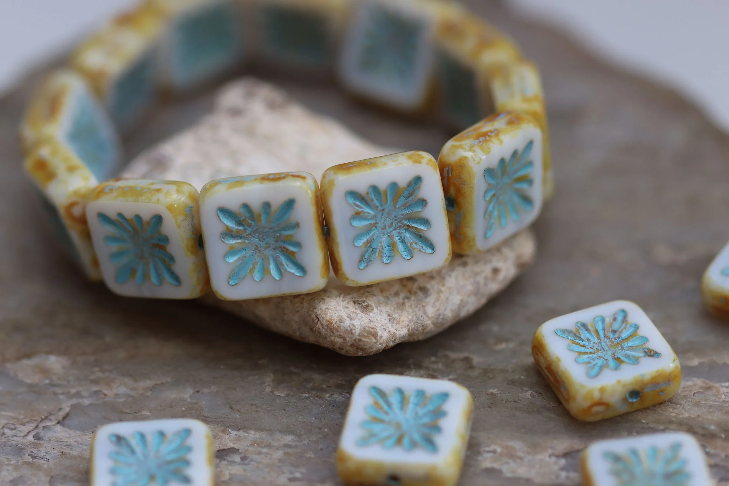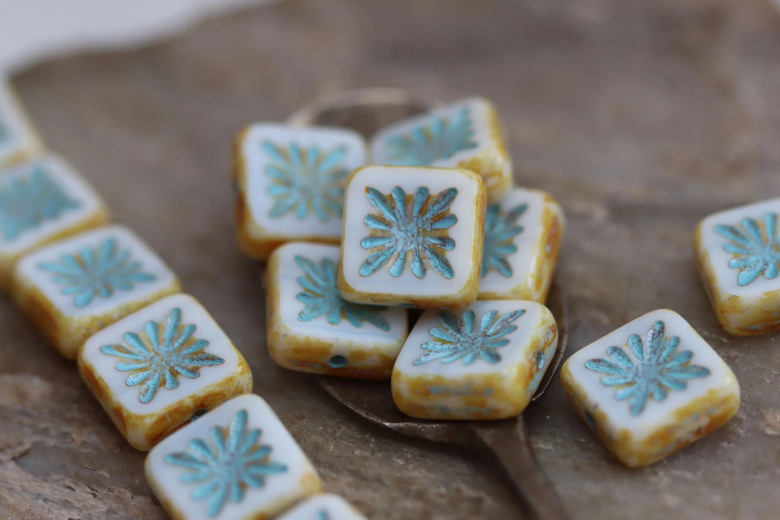 Green Turquoise Starburst Square Tile Czech Glass Beads 10mm, 6 or 10 Beads